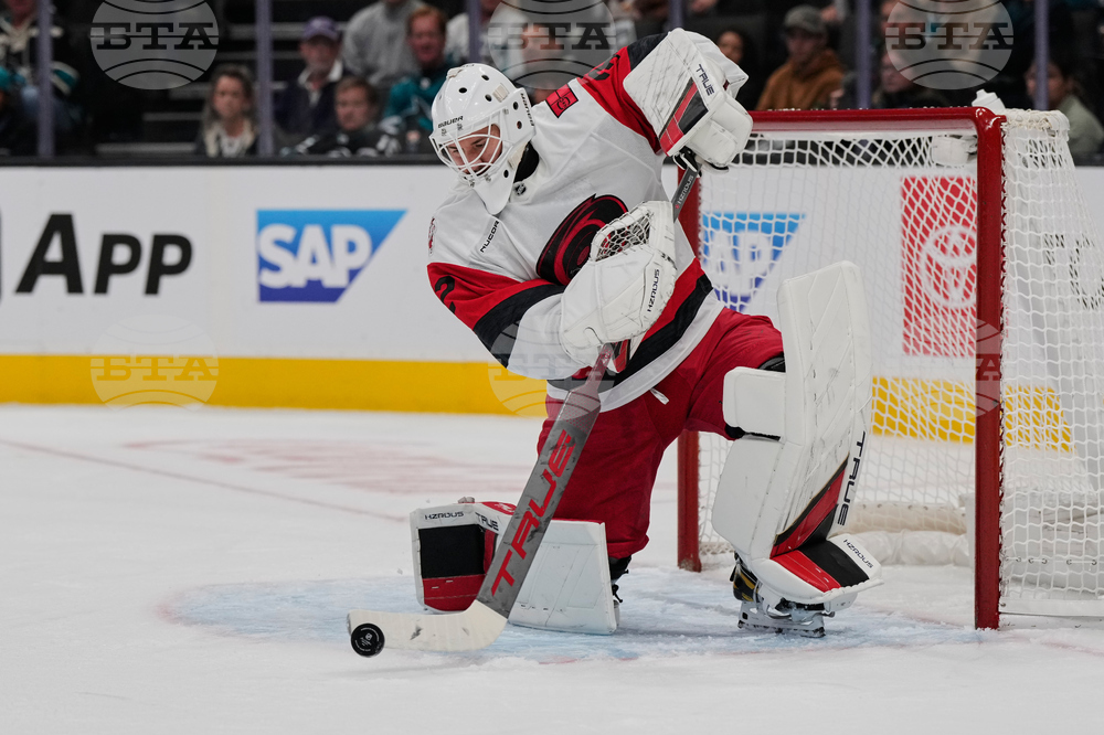 Carolina Hurricanes goaltender Brandon Bussi passes the puck during the first period of an NHL hockey game against the San Jose Sharks, Tuesday, Oct. 14, 2025, in San Jose, Calif. (AP Photo/Godofredo A. Vásquez)
