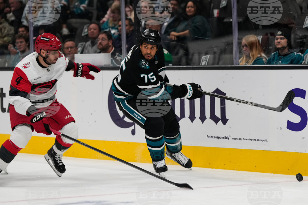Carolina Hurricanes defenseman Shayne Gostisbehere (4) and San Jose Sharks right wing Ryan Reaves (75) chase after the puck during the first period of an NHL hockey game, Tuesday, Oct. 14, 2025, in San Jose, Calif. (AP Photo/Godofredo A. Vásquez)