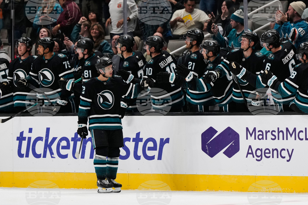 San Jose Sharks left wing William Eklund (72) celebrates with teammates after scoring a goal during the second period of an NHL hockey game against the Carolina Hurricanes, Tuesday, Oct. 14, 2025, in San Jose, Calif. (AP Photo/Godofredo A. Vásquez)