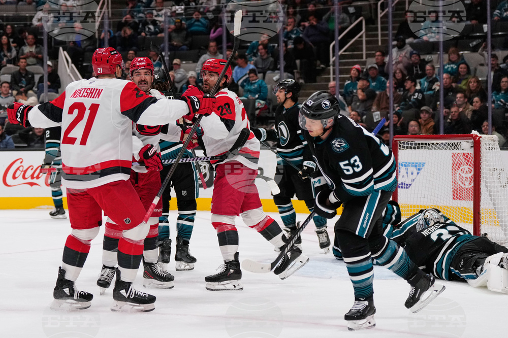 Carolina Hurricanes goaltender Brandon Bussi, center, watches a missed shot by San Jose Sharks' Jeff Skinner during the first period of an NHL hockey game, Tuesday, Oct. 14, 2025, in San Jose, Calif. (AP Photo/Godofredo A. Vásquez)