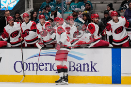 Carolina Hurricanes left wing Eric Robinson (50) celebrates with teammates after scoring a goal during the second period of an NHL hockey game against the San Jose Sharks, Tuesday, Oct. 14, 2025, in San Jose, Calif. (AP Photo/Godofredo A. Vásquez)