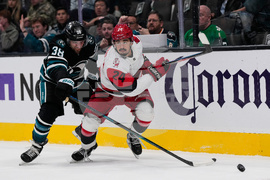 Carolina Hurricanes defenseman Shayne Gostisbehere (4) and San Jose Sharks center Ty Dellandrea (10) compete for possession of the puck during the third period of an NHL hockey game, Tuesday, Oct. 14, 2025, in San Jose, Calif. (AP Photo/Godofredo A. Vásquez)