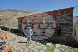 Raju Martolia holds a satellite phone outside his homestay in Martoli village in the northern Indian Himalayan state of Uttarakhand, on Oct. 4, 2025. (AP Photo/Satish Sharma)