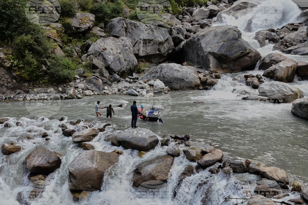 Motorcyclists make their way across a fast-flowing stream, on their way to the Nanda Devi base camp in Rilkot village, in the northern Indian Himalayan state of Uttarakhand, on Oct. 6, 2025. (AP Photo/Satish Sharma)