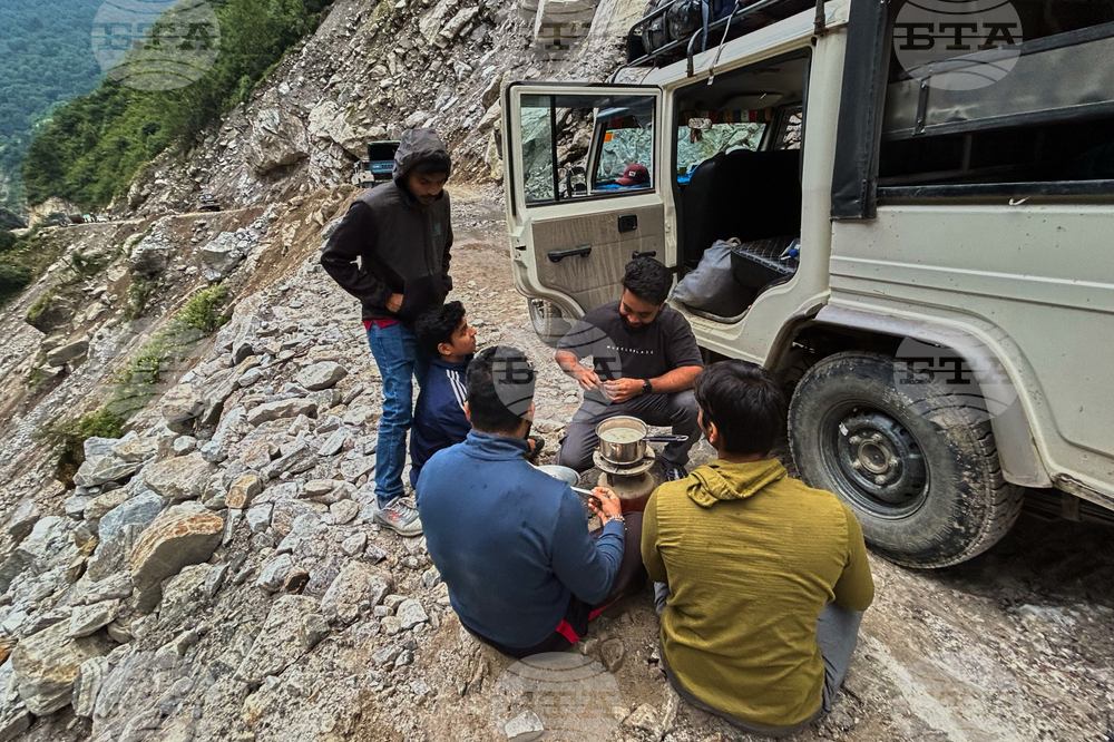 Travelers make tea as they wait for a mountain road to be cleared of debris near Laspa village, in the northern Indian Himalayan state of Uttarakhand, on Oct. 4, 2025. (AP Photo/Satish Sharma)