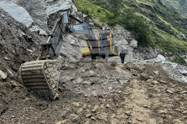 An earthmover clears a unpaved mountain road of debris near Laspa viallge, in the northern Indian Himalayan state of Uttarakhand, on Oct. 4, 2025. (AP Photo/Satish Sharma)