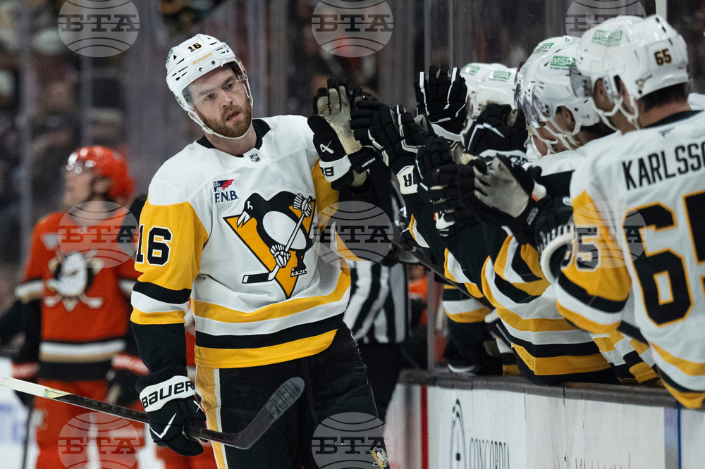 Pittsburgh Penguins right wing Justin Brazeau (16) celebrates his goal with the bench during the first period of an NHL hockey game against the Anaheim Ducks, Tuesday, Oct. 14, 2025, in Anaheim, Calif. (AP Photo/Kyusung Gong)