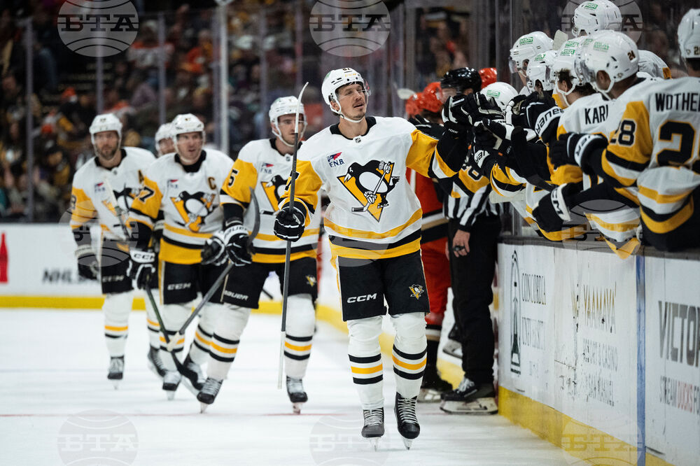 Pittsburgh Penguins right wing Justin Brazeau (16) celebrates his goal with center Evgeni Malkin (71) during the first period of an NHL hockey game against the Anaheim Ducks, Tuesday, Oct. 14, 2025, in Anaheim, Calif. (AP Photo/Kyusung Gong)