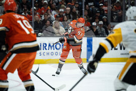 Anaheim Ducks center Leo Carlsson (91) shoots during the first period of an NHL hockey game against the Pittsburgh Penguins, Tuesday, Oct. 14, 2025, in Anaheim, Calif. (AP Photo/Kyusung Gong)