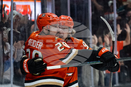 Anaheim Ducks center Mikael Granlund (64) reacts on a goal by left wing Chris Kreider (20) during the third period of an NHL hockey game against the Pittsburgh Penguins, Tuesday, Oct. 14, 2025, in Anaheim, Calif. (AP Photo/Kyusung Gong)