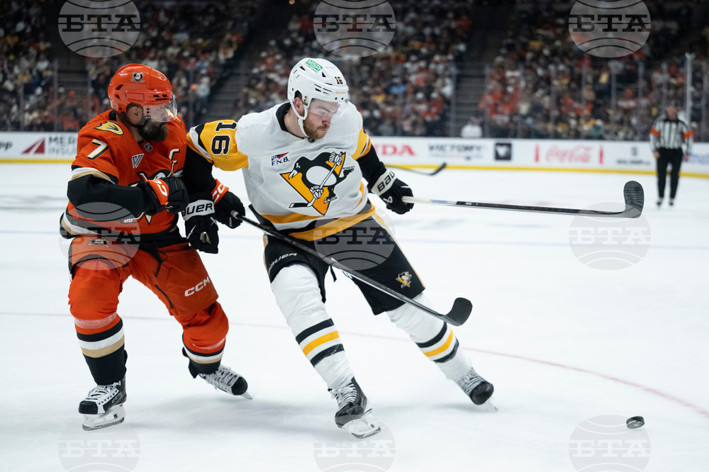 Anaheim Ducks defenseman Olen Zellweger (51) controls the puck past Pittsburgh Penguins defenseman Kris Letang (58) during the first period of an NHL hockey game, Tuesday, Oct. 14, 2025, in Anaheim, Calif. (AP Photo/Kyusung Gong)
