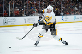 Pittsburgh Penguins center Evgeni Malkin (71) shoots during the second period of an NHL hockey game against the Anaheim Ducks, Tuesday, Oct. 14, 2025, in Anaheim, Calif. (AP Photo/Kyusung Gong)