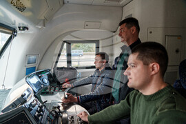 Oleh Pryshchepa, 54, second right, a train driver, rides at the train driver's cabin in Kyiv, Ukraine, Friday, Oct. 3, 2025. (AP Photo/Vasilisa Stepanenko)
