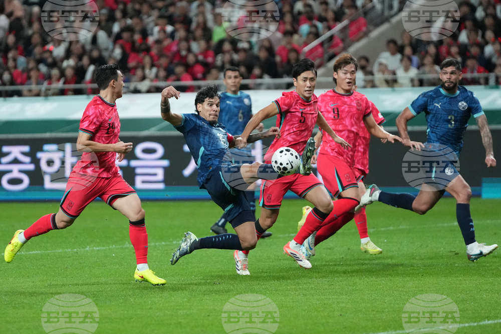 Paraguay's Gustavo Gomez makes an attempt to score during the international friendly soccer match between South Korea and Paraguay at Seoul World Cup Stadium in Seoul, South Korea, Tuesday, Oct. 14, 2025. (AP Photo/Lee Jin-man)