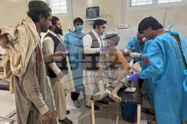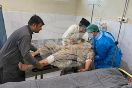 People bring a man, who was injured in the clashes between Pakistan and Afghan forces in border area, for medical treatment at a hospital in Chaman, a town on the Pakistan side of the border, Wednesday, Oct. 15, 2025. (AP Photo/H. Achakzai)