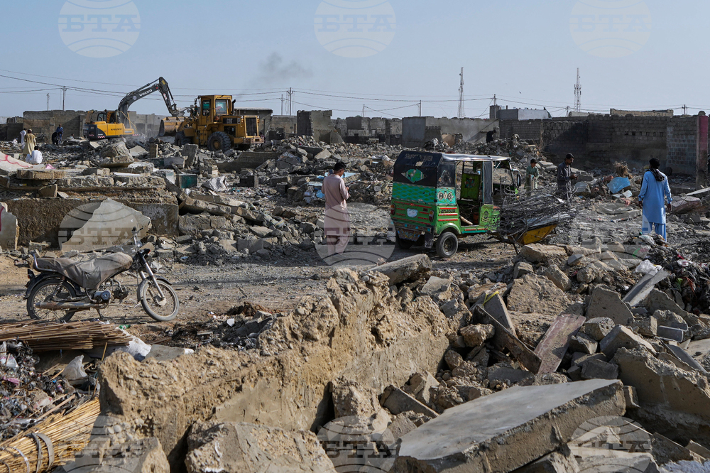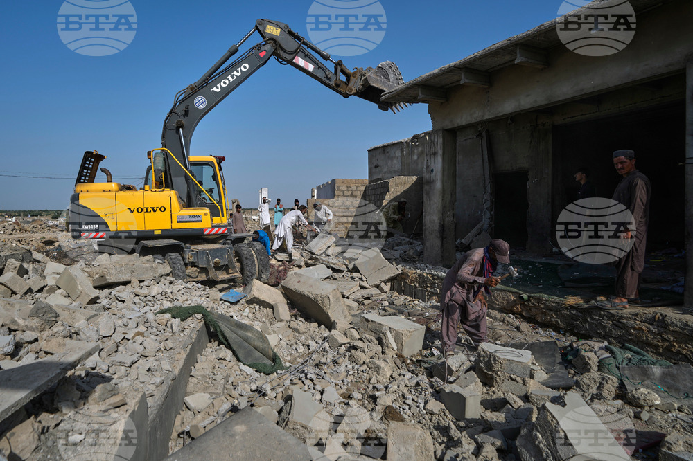 A hydraulic shovel demolish a structure during an operation against illegal settlement of Afghan refugees conducted by local government, on the outskirts of Karachi, Pakistan, Wednesday, Oct. 15, 2025. (AP Photo/Fareed Khan)