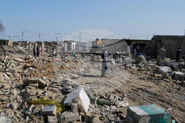 People walk through rubble as a hydraulic shovel demolish a structure during an operation against illegal settlement of Afghan refugees conducted by local government, on the outskirts of Karachi, Pakistan, Wednesday, Oct. 15, 2025. (AP Photo/Fareed Khan)