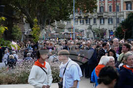 A crowd of pilgrims queue to enter St. Peter's Square, to attend Pope Leo XIV general audience, at the Vatican, Wednesday, Oct. 15, 2025. (AP Photo/Gregorio Borgia)