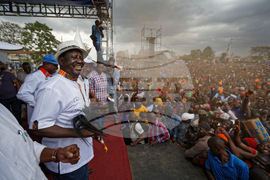 FILE - Kenyan opposition leader Raila Odinga, left, dances after arriving at a rally attended by thousands of supporters in the Shauri Moyo area of Nairobi, Kenya Wednesday, Oct. 18, 2017. (AP Photo/Ben Curtis, File)