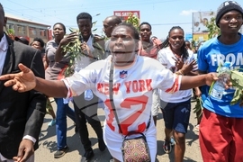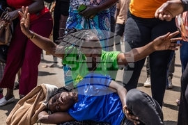 People react in the Kibera neighborhood of Nairobi, Kenya, to the death of Kenya former prime minister Raila Odinga Wednesday, Oct. 15, 2025. Odinga died of a heart attack in Indiaat the age of 80. (AP Photo/Andrew Kasuku)