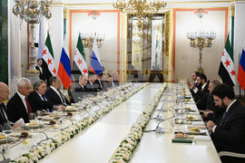 Russian President Vladimir Putin, fivth left, and Syrian interim President Ahmad al-Sharaa, third right, attend the talks at the Grand Kremlin Palace in Moscow, Russia, Wednesday, Oct. 15, 2025. (Sergei Bobylev, Sputnik, Kremlin Pool Photo via AP)