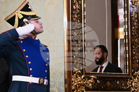 Syrian interim President Ahmad al-Sharaa, right, is reflected in a mirror as he enters a hall for his talks with Russian President Vladimir Putin at the Grand Kremlin Palace in Moscow, Russia, Wednesday, Oct. 15, 2025. (Sergei Bobylev, Sputnik, Kremlin Pool Photo via AP)
