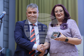София (15 октомври 2025) Церемонията по връчване на наградата „Българка на година - Света Злата Мъгленска 2024” се провежда в Университета за национално и световно стопанство (УНСС). Събитието е организирано от Изпълнителната агенция за българите в чужбина. На снимката: генералният директор на Българската телеграфна агенция (БТА) Кирил Вълчев награждава Анита Екенова с приза „Българка на годината - Света Злата Мъгленска 2024“.