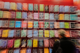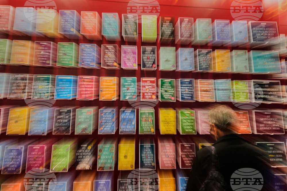 In this image made with a zoom lens and slow shutter speed, a bookshelf is pictured at the first media day of the Book Fair in Frankfurt, Germany, Wednesday, Oct. 15, 2025. (AP Photo/Michael Probst)
