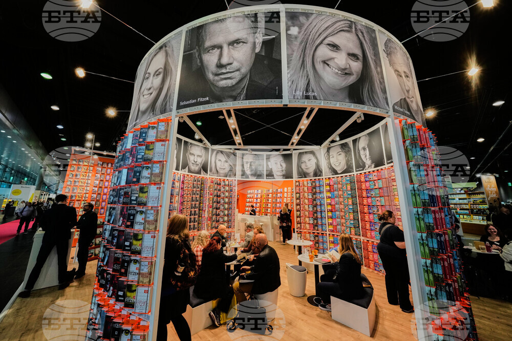 Bookshelves are pictured on the first media day of the Book Fair in Frankfurt, Germany, Wednesday, Oct. 15, 2025. (AP Photo/Michael Probst)