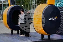 Visitors stand near giant head phones on the first media day of the Book Fair in Frankfurt, Germany, Wednesday, Oct. 15, 2025. (AP Photo/Michael Probst)