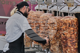 Doner skewers wait for hungry visitors on the first media day of the Book Fair in Frankfurt, Germany, Wednesday, Oct. 15, 2025. (AP Photo/Michael Probst)