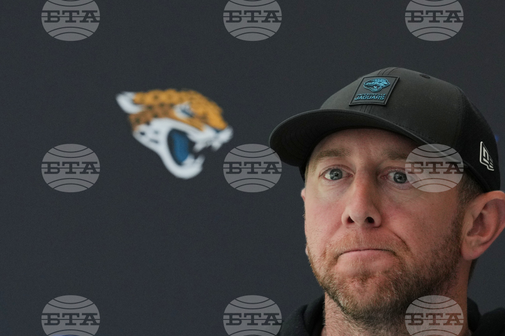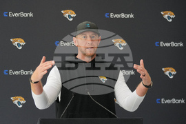 Jacksonville Jaguars head coach Liam Coen speaks during a press conference at an NFL football practice at The Grove in Watford, England, Wednesday, Oct. 15, 2025. (AP Photo/Kin Cheung)