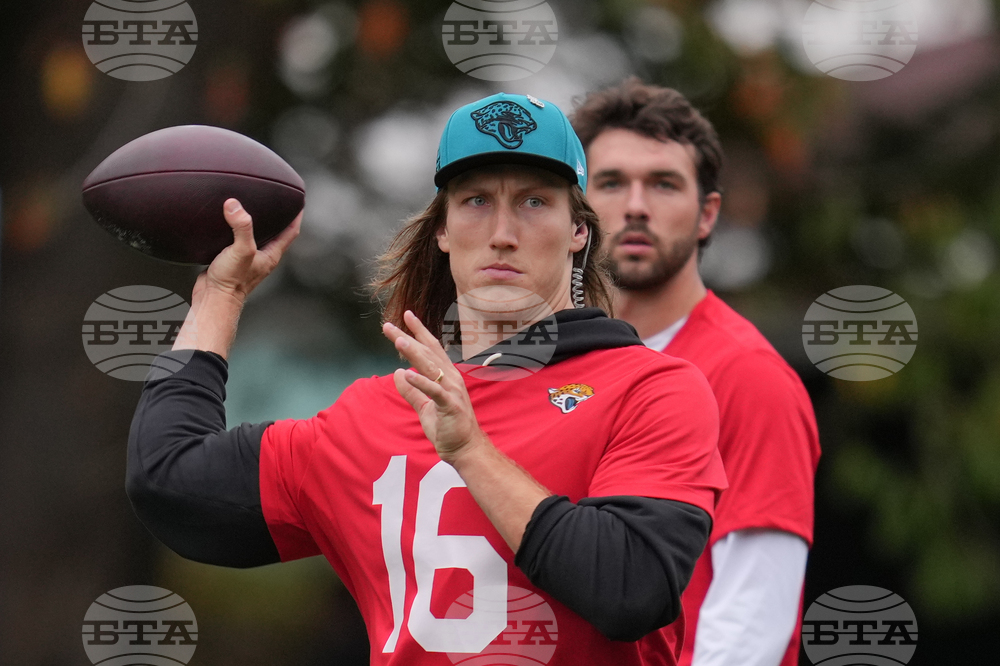 Jacksonville Jaguars quarterback Trevor Lawrence (16) works out during an NFL football practice at The Grove in Watford, England, Wednesday, Oct. 15, 2025. (AP Photo/Kin Cheung)