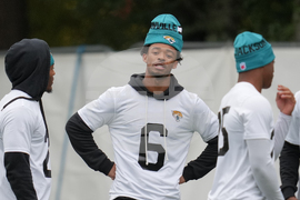 Jacksonville Jaguars quarterback Trevor Lawrence (16) smiles during an NFL football practice at The Grove in Watford, England, Wednesday, Oct. 15, 2025. (AP Photo/Kin Cheung)