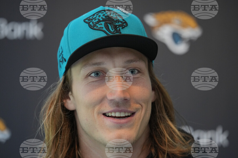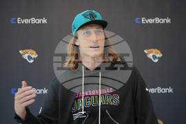 Jacksonville Jaguars quarterback Trevor Lawrence speaks during a press conference at an NFL football practice at The Grove in Watford, England, Wednesday, Oct. 15, 2025. (AP Photo/Kin Cheung)