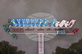 Pedal boats waiting for customers at an empty pier in changeable autumn weather at a lake in Gelsenkirchen, Germany, Wednesday, Oct. 15, 2025. (AP Photo/Martin Meissner)