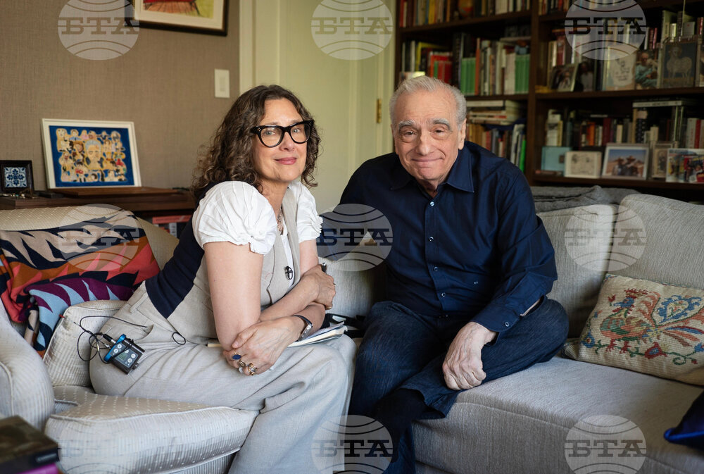 This image released by Apple TV+ shows Rebecca Miller, left, with Martin Scorsese from the documentary series "Mr. Scorsese." (Apple TV+ via AP)