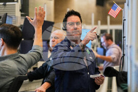 Specialist Michael Pistillo, left, and trader Fred Demarco work on the floor of the New York Stock Exchange, Wednesday, Oct. 15, 2025. (AP Photo/Richard Drew)