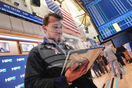 Trader Michael Capolino works on the floor of the New York Stock Exchange, Wednesday, Oct. 15, 2025. (AP Photo/Richard Drew)