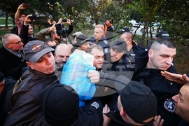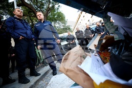 София (15 октомври 2025) Акция „Боклук за боклука“, организирана от гражданско движение „БОЕЦ”, се провежда пред сградата на МВР. На снимката: лидерът на гражданско движение „БОЕЦ” Георги Георгиев (вляво).