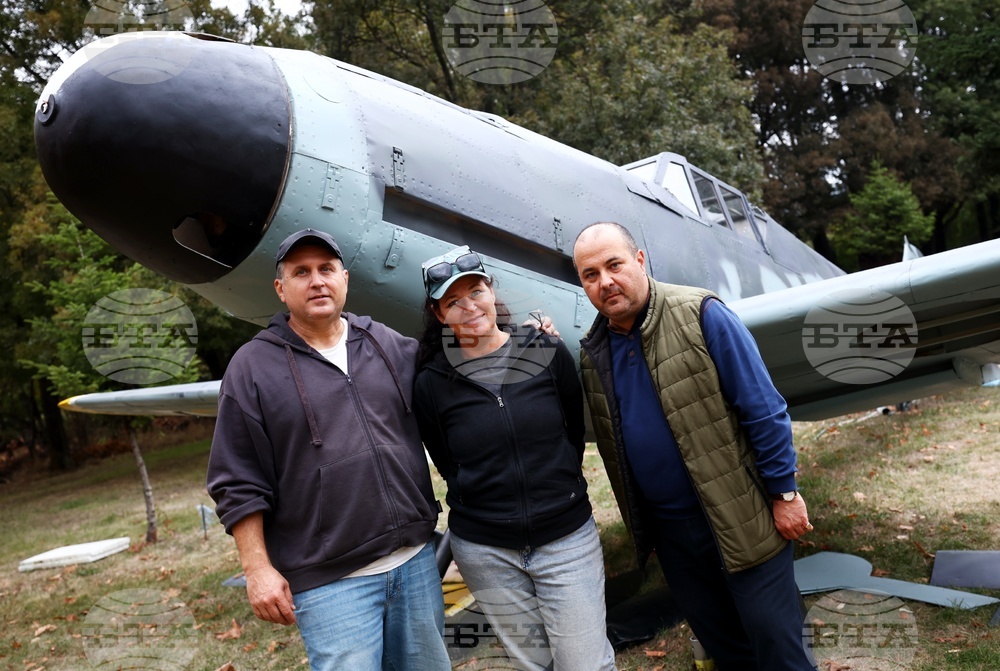София (16 октомври 2025) В парковото пространство на Националния исторически музей (НИМ) се конструира копие на самолета на капитан Димитър Списаревски по инициатива на Асоциацията за история и бъдеще на българската авиация (АИББА). На снимката (от ляво надясно): Румен Чакъров, Нели Чакърова и Никола Захариев.