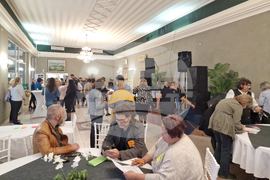 Търговище (15 октомври 2025) Инициативата „Борса на проекти и идеи“ среща интересите на бизнеса и гражданските организации в Търговище. Форумът отчита интересите и възможностите и на двата сектора, като дава шанс за договаряне на конкретни проекти. Скоро след началото на борсата бяха подписани и първите договори. „Борса на проекти и идеи“ е резултат от съвместните работа на Клуба на нестопанските организации в областния град и Платформа „Агора“. На снимката: кметът на Търговище Дарин Димитров приветства участниците във форума.