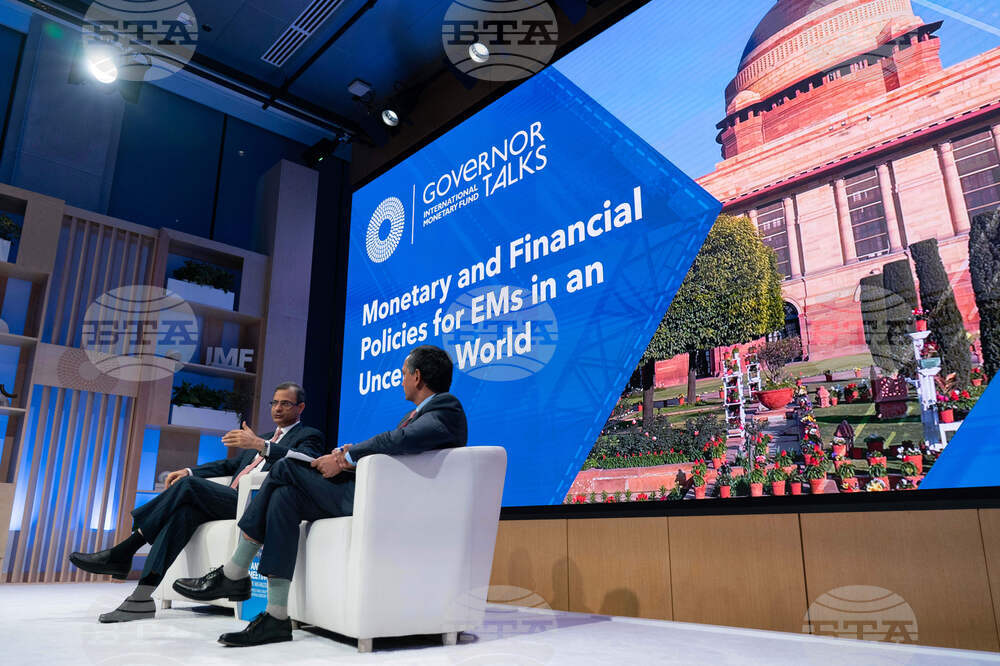 Governor of the Reserve Bank of India Sanjay Malhotra and Director of the Asia and Pacific Department, IMF Krishna Srinivasan speak at Governor Talks conference during the World Bank/IMF Annual Meetings at the International Monetary Fund (IMF) headquarters in Washington, Wednesday, Oct. 15, 2025. (AP Photo/Jose Luis Magana)