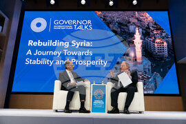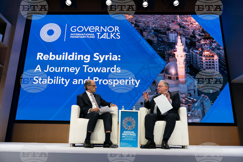 Syrian Finance Minister Mohammed Yisr Barnieh, right, speaks at Governor Talks conference during the World Bank/IMF Annual Meetings at the International Monetary Fund (IMF) headquarters in Washington, Wednesday, Oct. 15, 2025. (AP Photo/Jose Luis Magana)