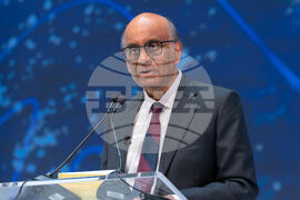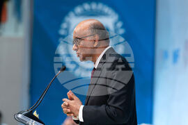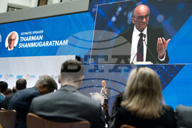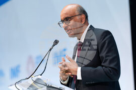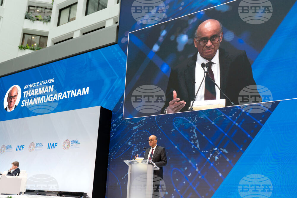 Singapore's President Tharman Shanmugaratnam speaks at a conference during the World Bank/IMF Meetings at the International Monetary Fund (IMF) headquarters in Washington, Wednesday, Oct. 15, 2025. (AP Photo/Jose Luis Magana)