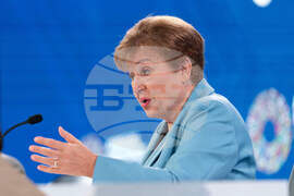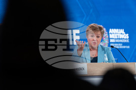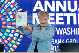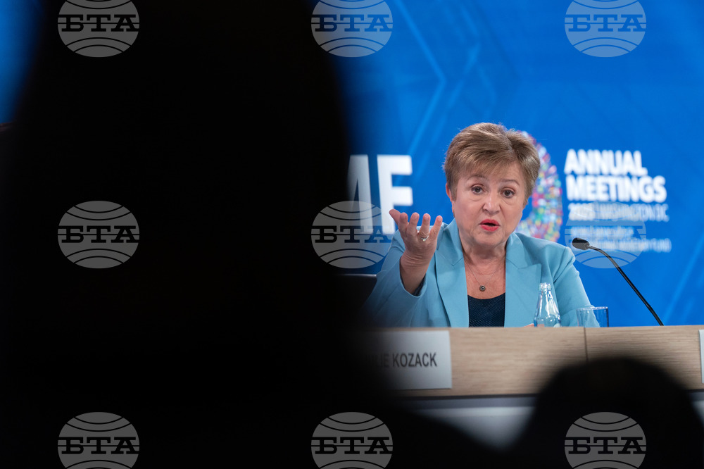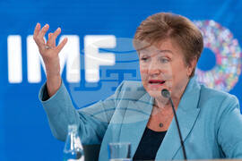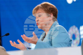 Kristalina Georgieva, International Monetary Fund (IMF) managing director, speaks at a news conference during the World Bank/IMF Annual Meetings at the International Monetary Fund (IMF) headquarters in Washington, Thursday, Oct. 16, 2025. (AP Photo/Jose Luis Magana)