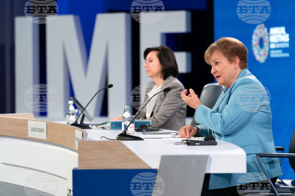 Kristalina Georgieva, International Monetary Fund (IMF) managing director, right, speaks alongside IMF communications director Julie Kozack at a news conference during the World Bank/IMF Annual Meetings at the International Monetary Fund (IMF) headquarters in Washington, Thursday, Oct. 16, 2025. (AP Photo/Jose Luis Magana)