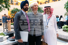 World Bank President Ajay Banga, from left, European Central Bank President Christine Lagarde and Saudi Arabia's Finance Minister Mohammed Al-Jadaan pose for a photo as they attend the G20 meeting during the World Bank/IMF Annual Meetings at the International Monetary Fund (IMF) headquarters in Washington, Thursday, Oct. 16, 2025. (AP Photo/Jose Luis Magana)