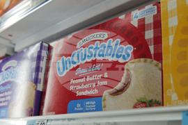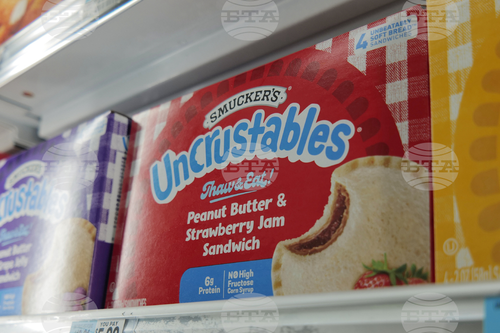 A box of Smucker's Uncrustables sandwiches are seen in a freezer of a supermarket in New York on Wednesday, Oct. 15, 2025. (AP Photo/Patrick Sison)