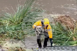 This photo provided by Ventura County Fire Department, VCFD and Oxnard Fire Department rescue a dog trapped in a flood channel in the Oxnard plains in Ventura County, Calif., on Tuesday, Oct. 14, 2025. (Ventura County Fire Department via AP)